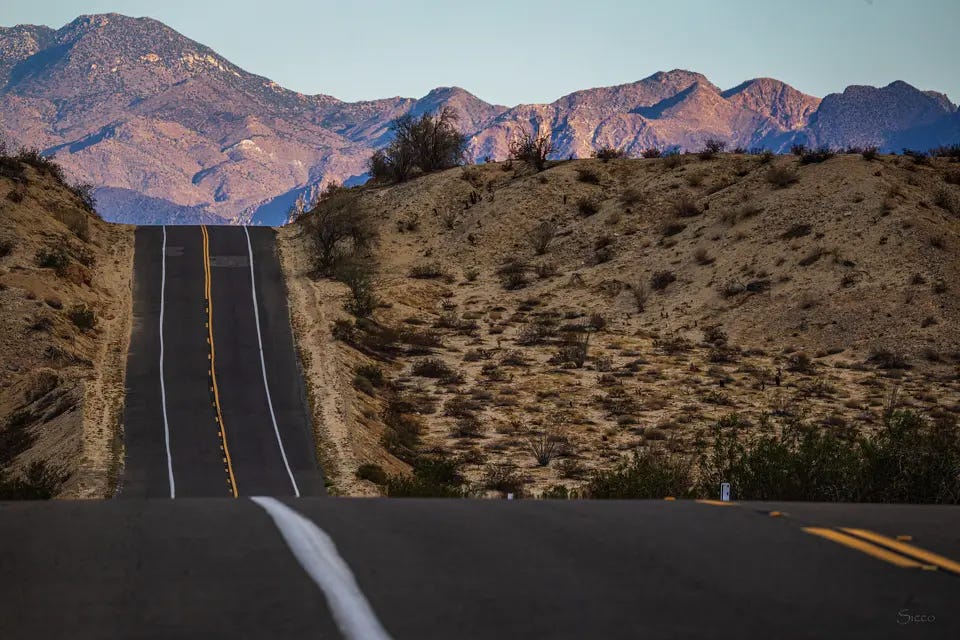 When I say this is the ‘wrong way of filming a chase’, I mean that the running in this case is just a narrative tool. Those scenes end up running on empty: DiCaprio doesn’t need to run to go to Del Toro’s place; he could just give him a phone call, he doesn’t even need to run with Del Toro’s students through the rooftop; he could just walk out through the basement with the migrants. Those chases are artificial constructs, and this is why they feel fake. Come the car pursuit in the rolling hills of Borrego Springs, and all of a sudden, we are truly there.